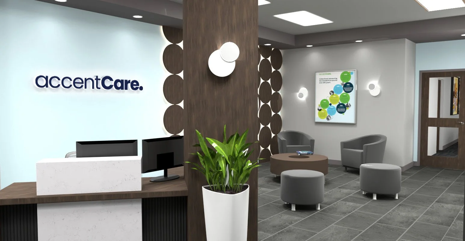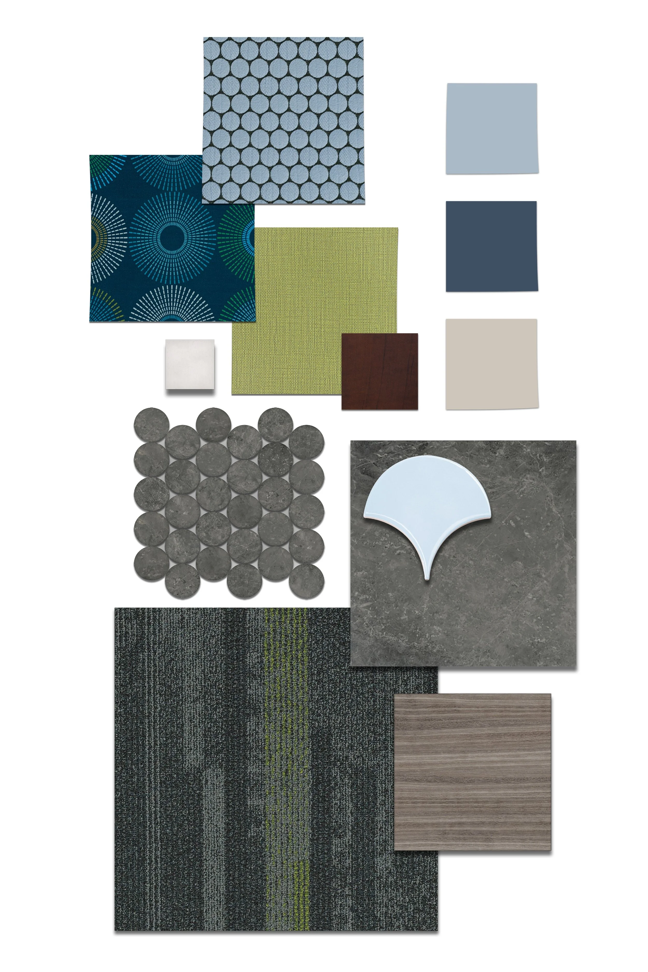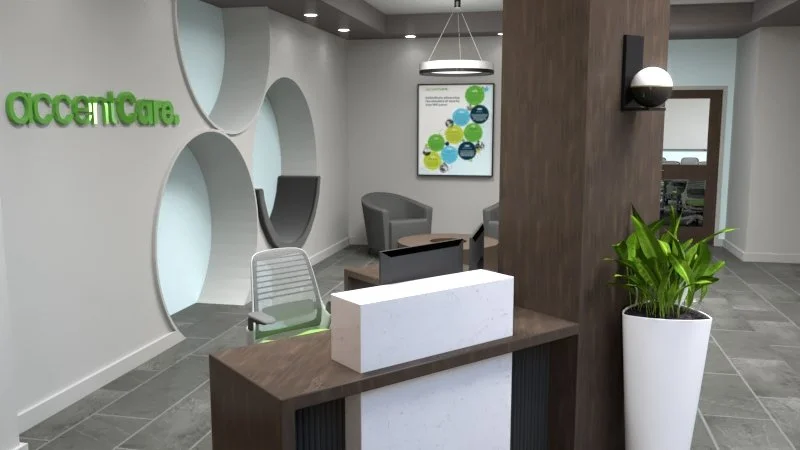Successful communication of branding through interior finishes is enjoyable and gratifying. This project was especially so, given I was apart of the branding team to roll-out a new logo, colors, fonts, etc. across the entire company of 100+ locations. Taking my intimate knowledge of the 108 page branding standards booklet, I came up with an interior finish palette to coordinate! I focused on the circular elements, main colors of lime green (not too much of course!) and light blue, and visual movement to depict the brand of a company that is “reimaging care.” I wanted to evoke an excitement, a lively work environment - to draw in talent and an uplifting office culture.