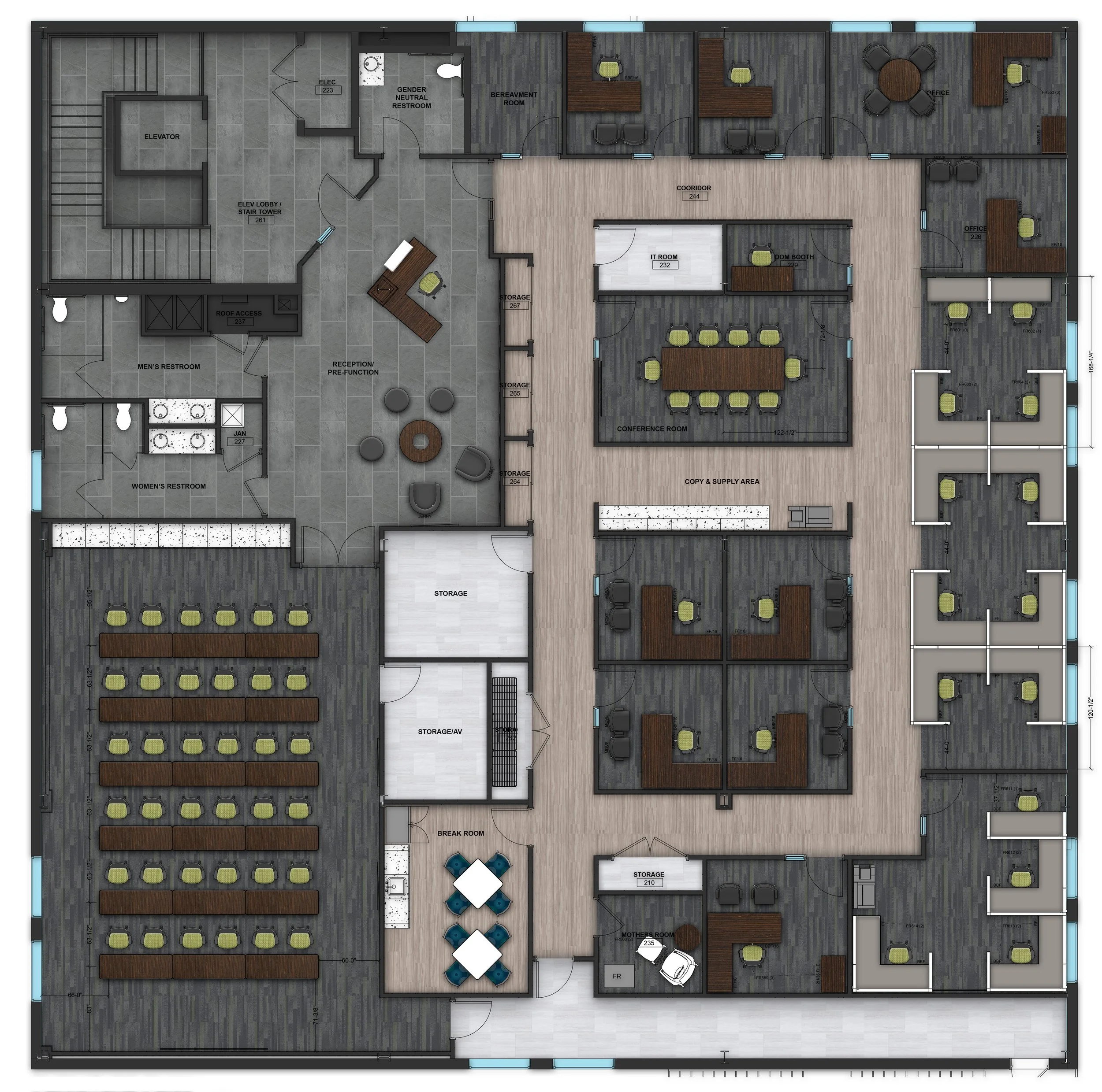I absolutely love to space plan, is the long and short of it! Achieving the perfect balance of functionality and aesthetic are my top priorities. When I’m ready to bring finishes into the mix… I’m thinking about acoustics, traffic, and making a statement. I created this rendered floor plan to visually communicate the floor plan and associated finishes to the stakeholders.